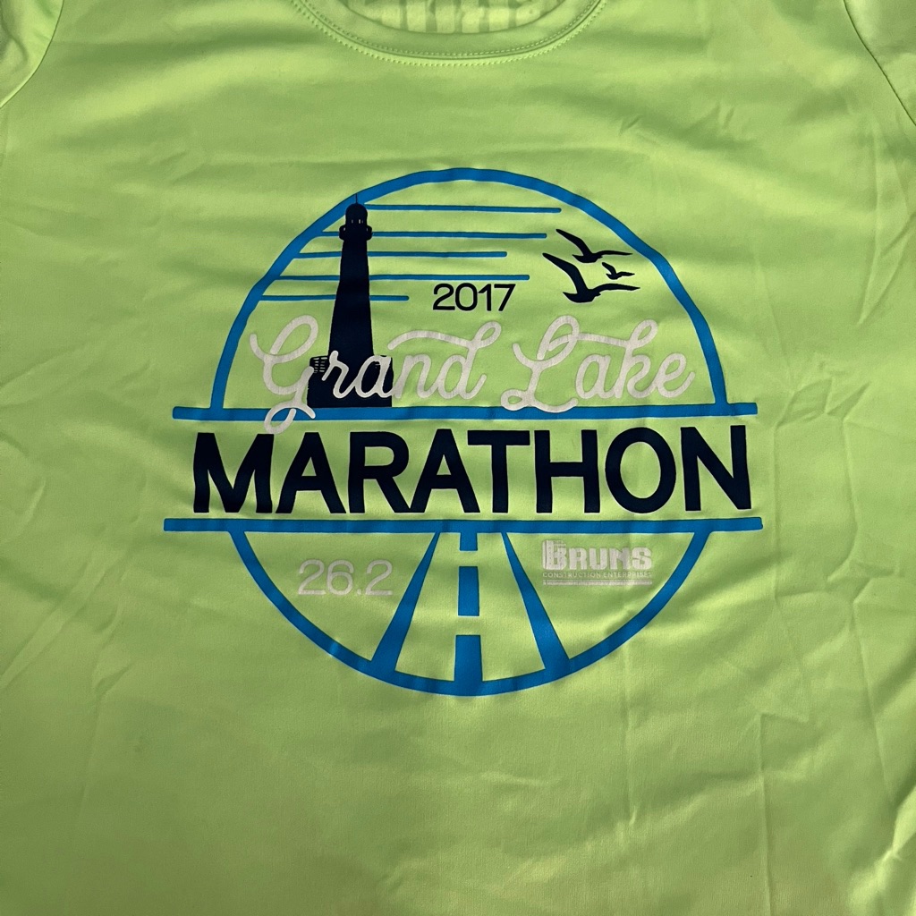 #2 Grand Lake Marathon 2017. I love the bright yellow-green color of this shirt. This is a cute shirt that I wear often. The logo design is on point.