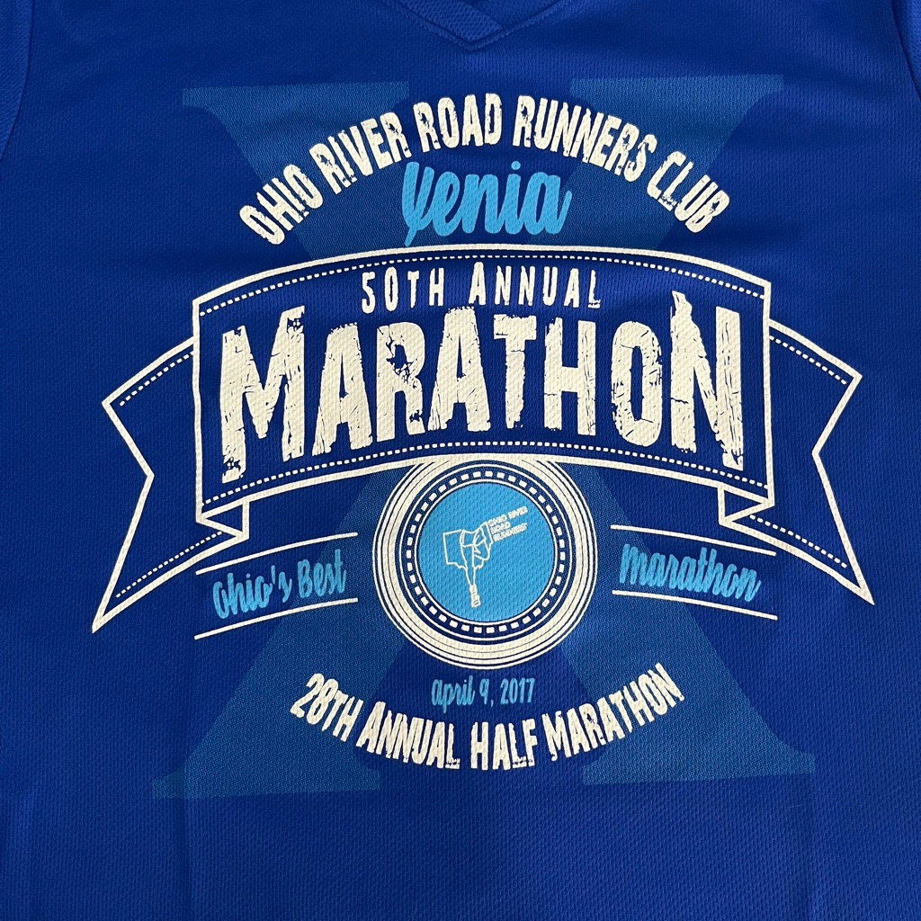 #10 Xenia Marathon 2017. This shirt represents my first PR at the Xenia Marathon. I ran the Full Marathon because it was the same price as the Half. I like the bright blue color of this shirt and the big Marathon across the front.