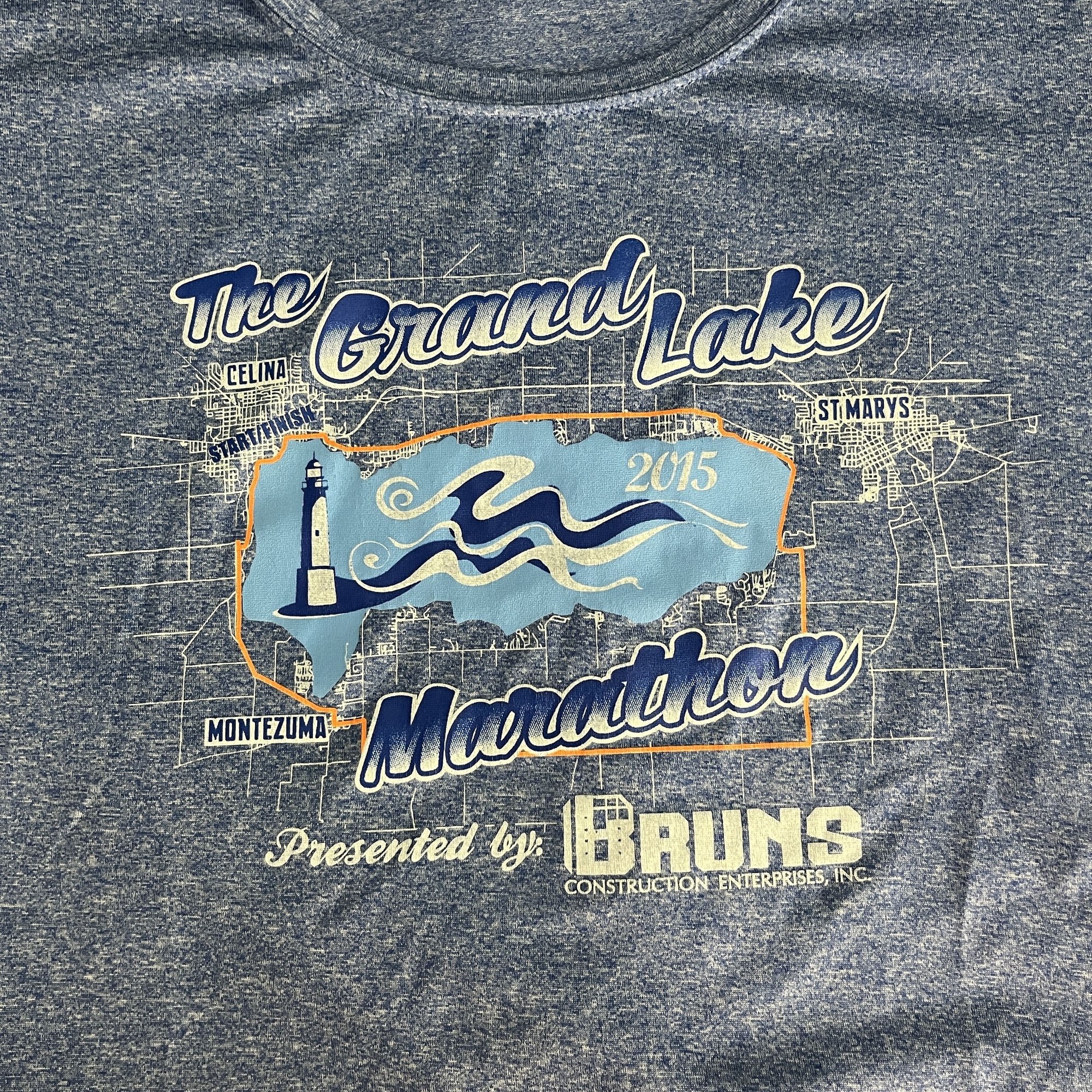 #4 Grand Lake Marathon 2015. The course for the Marathon, a loop around the entire lake, is depicted on this cute shirt. The shirt is blue even though the photo looks grey. This was a fun race and really cool to look at the map and say I ran all the way around a lake. This is also the race that I qualified for Marathon Maniacs Club by running marathons on back to back weekends.