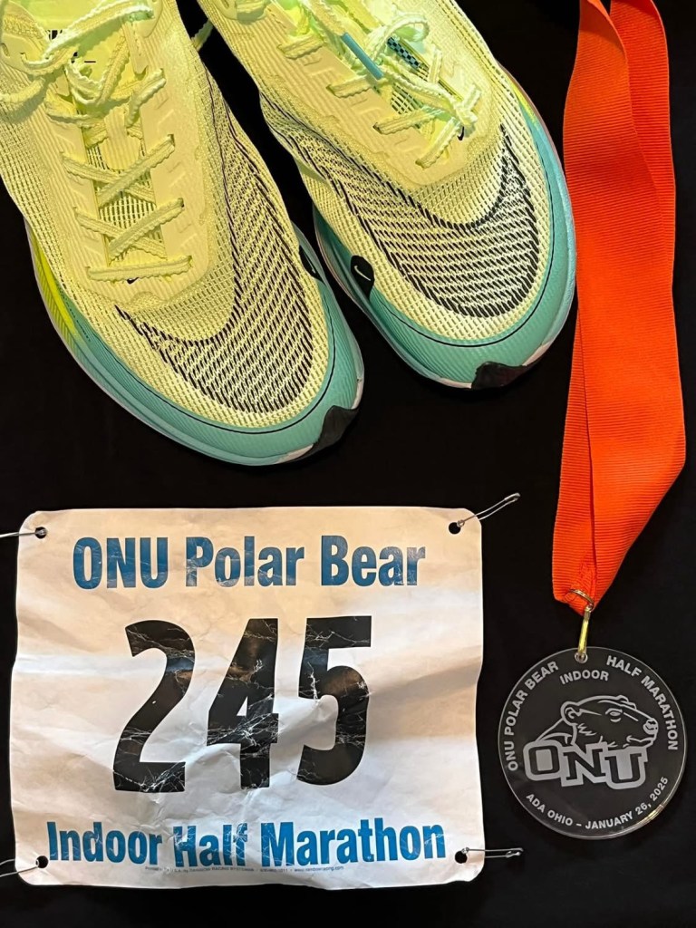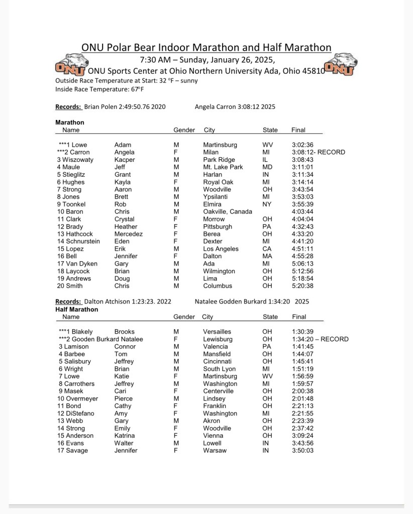 The 2025 ONU Polar Bear Marathon and Half Marathon took place on January 26th at Ohio Northern University in Ada, Ohio. This is an indoor race with participants running either 105.5 loops around the 200 meter track for the Half Marathon or 211 loops for the full Marathon.