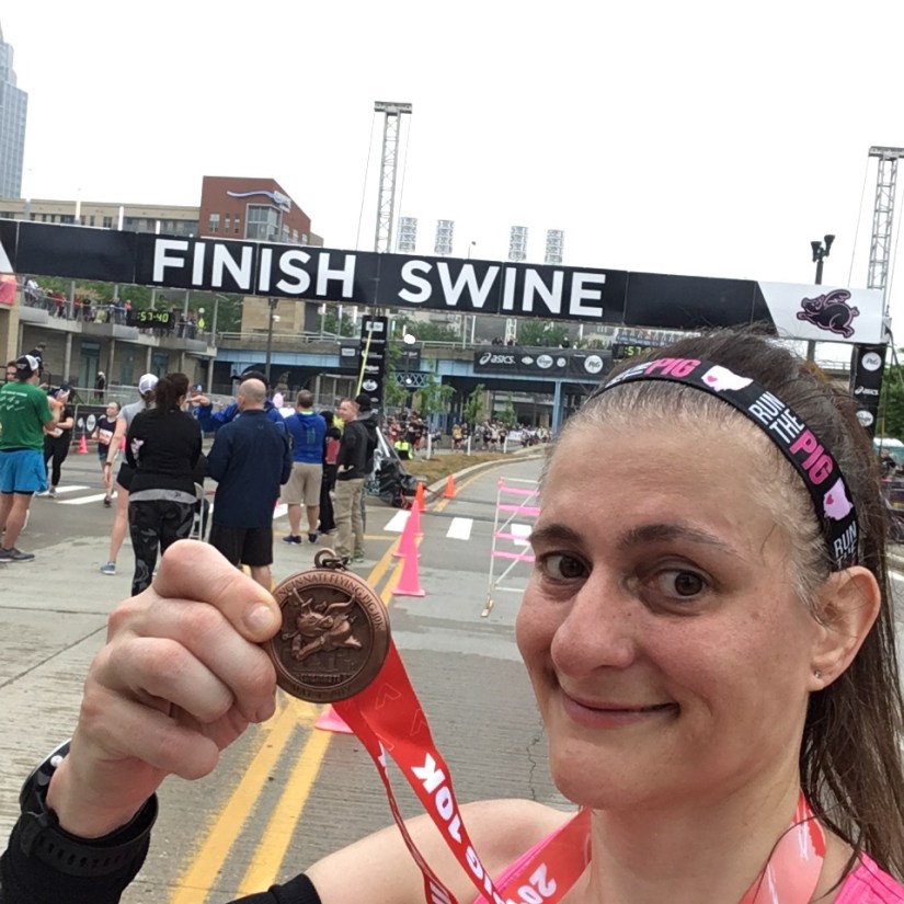 I made it to the Finish Swine in 49:41, with a new PR, proving that I belonged in Pig Pen A today. In a huge field of over 5000 runners in today’s 10k event, I placed 10th in my age group out of 584 woman, finishing in the top 2% overall.